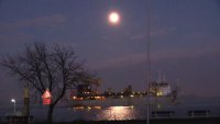 Größter Supermond des Jahres über der Elbe im Alten Land zwischen Leuchttürmen und Schiffen am Abend in der Nacht und am Morgen